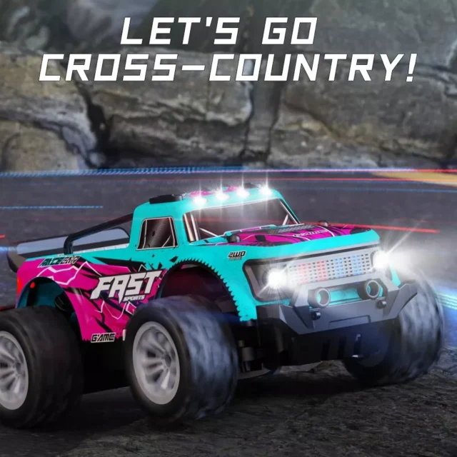 Equipped with a precision carbon brush motor, it reaches speeds of up to 15MPH and handles with the responsiveness of a real vehicle. The 4-channel controller allows for smooth steering, braking, and reversing – giving full control of every turn and stunt. It features working front and rear lights for night-time visibility and rugged tires for serious grip on dirt, gravel, or pavement. This remote control truck is built tough with impact-resistant ABS plastic, making it ready for rough play and all kinds of terrain.
