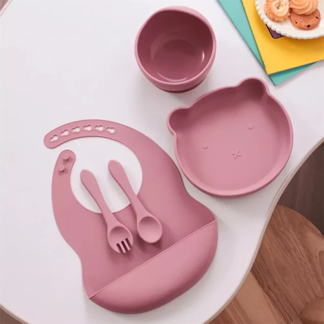 Turn everyday feeding into a smooth, joyful experience with this adorable 5-piece bear-shaped silicone baby feeding set. Designed for toddlers learning to eat independently, this set includes a suction plate, spoon, fork, bib, and cup lid. The playful bear design captures your child’s attention, while the clever suction base keeps the plate in place, preventing messy spills.