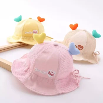Pink Baby Fisherman Hat with Heart & Windproof Rope – Sun Protection for 5-24 Months