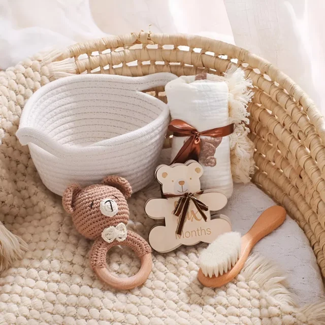 Crafted from natural, safe materials, the set features a delightful crochet bear rattle, wooden brush, and milestone cards. These items are designed to engage and stimulate your little one’s senses while encouraging motor skills and hand-eye coordination. The soft, crochet textures of the bear rattle are ideal for tiny hands, while the smooth wooden brush is gentle on delicate skin.