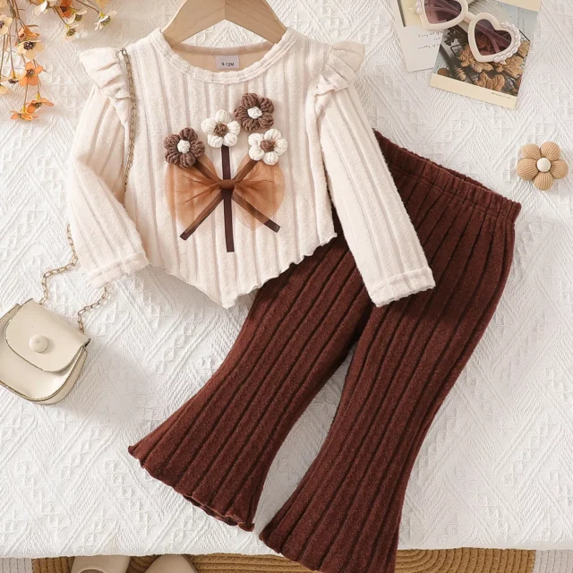 Unlike ordinary baby clothes, this two-piece set balances functionality with design. The charming details and thoughtful construction make it stand out as a must-have in your baby’s wardrobe. Easy to mix and match with other pieces, the brown bell bottoms pair beautifully with sweaters, jackets, or even onesies. The floral bow top, on the other hand, can be dressed up or down, making it versatile for different occasions.