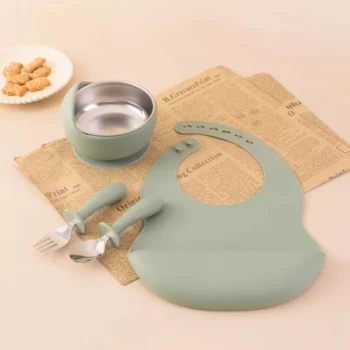 Baby Feeding Set with Stainless Steel Utensils, Sucker Bowl & Silicone Bib – 4PCS