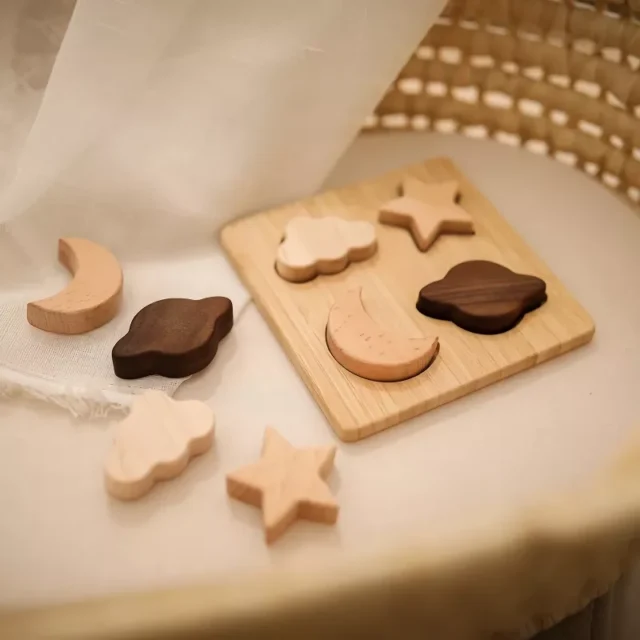 Unlike plastic toys that clutter your space, this puzzle’s minimalist wooden aesthetic fits beautifully in any nursery. The stars and moons create a whimsical connection to nature and the universe, sparking early wonder and curiosity. Most importantly, it supports developmental milestones in a safe, toxin-free, and enjoyable way.