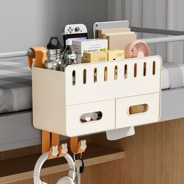 Designed for modern living, this multi-functional bedside storage box easily hooks onto your bed frame, rails, or headboard—no tools or installation required. Crafted from durable, easy-to-clean plastic, it offers multiple compartments for all your bedside essentials. A built-in tissue holder adds to its clever design, while the included hook is perfect for hanging headphones, cords, or small accessories.