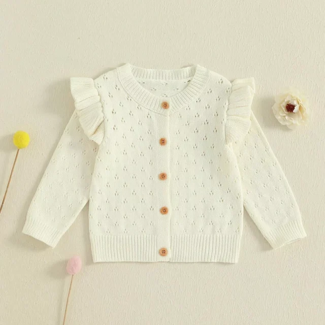 Keep your baby girl warm, stylish, and comfortable with this beautifully knitted cardigan. Designed with a classic crew neck and adorable ruffle trim, this button-up sweater is perfect for adding charm to her everyday outfits. The hollowed knit pattern brings a touch of elegance, while the soft blend of viscose, polyester, and polyamide ensures lasting comfort against delicate skin.
