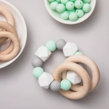 Wooden Baby Rattle Ring with BPA-Free Silicone Teething Beads